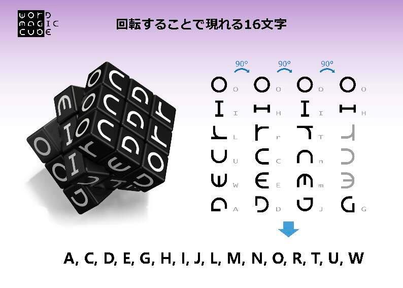 6つの面に書かれたマークはアルファベットです。6種類のマークが向きを変えると様々なアルファベットに変化。合計16個のアルファベットになります。